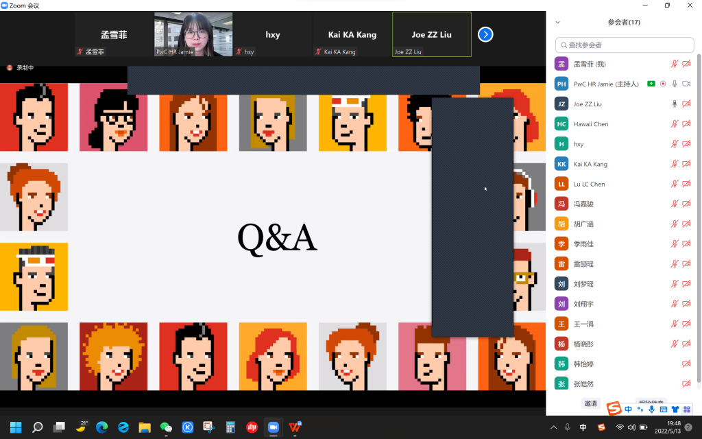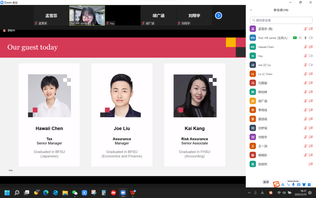 HR of PWC, Jamie, introduced to students the current development and recruitment requirements of the company and gave guidance to the students on job-hunting and career development. Hawaii Chen, BFSU graduate from Japanese major and senior manager of the tax department, introduced the business and work content of the tax department to the students with real-life cases. Joe Lie, an audit manager who graduated from IBS, firstly answered the research question of students’ group report, provided them with a lot of pertinent advice on case analysis, and introduced the work of audit. Kai Kang, a senior consultant in the risk consulting department, gave a detailed presentation on doing the risk consulting project.