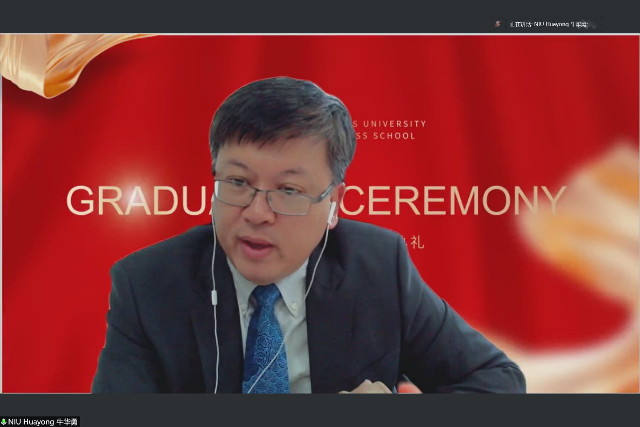 On the afternoon of July 6, the International Business School Of Beijing Foreign Studies University held the 2022 online graduation ceremony for international students. Niu Huayong, the Acting Dean of the International Business School, Li Wenbin,?Director of Student Affairs Office, Lian Zeng, Deputy Director of the Graduate Teaching and Academic Affairs Office, and faculties from the International Students Offices and the other offices attended the ceremony.