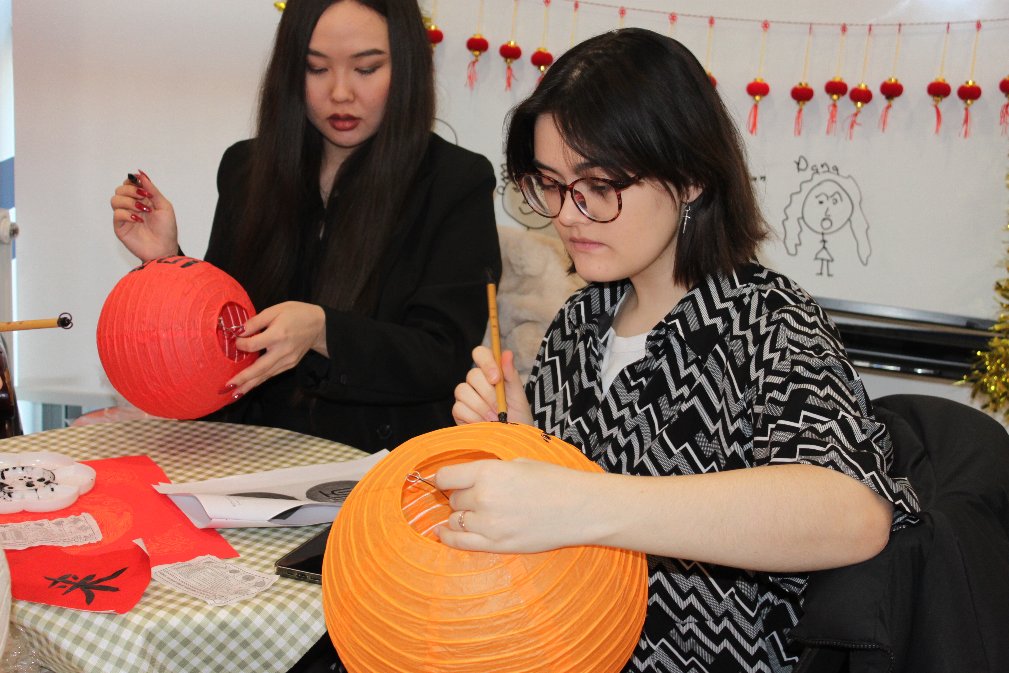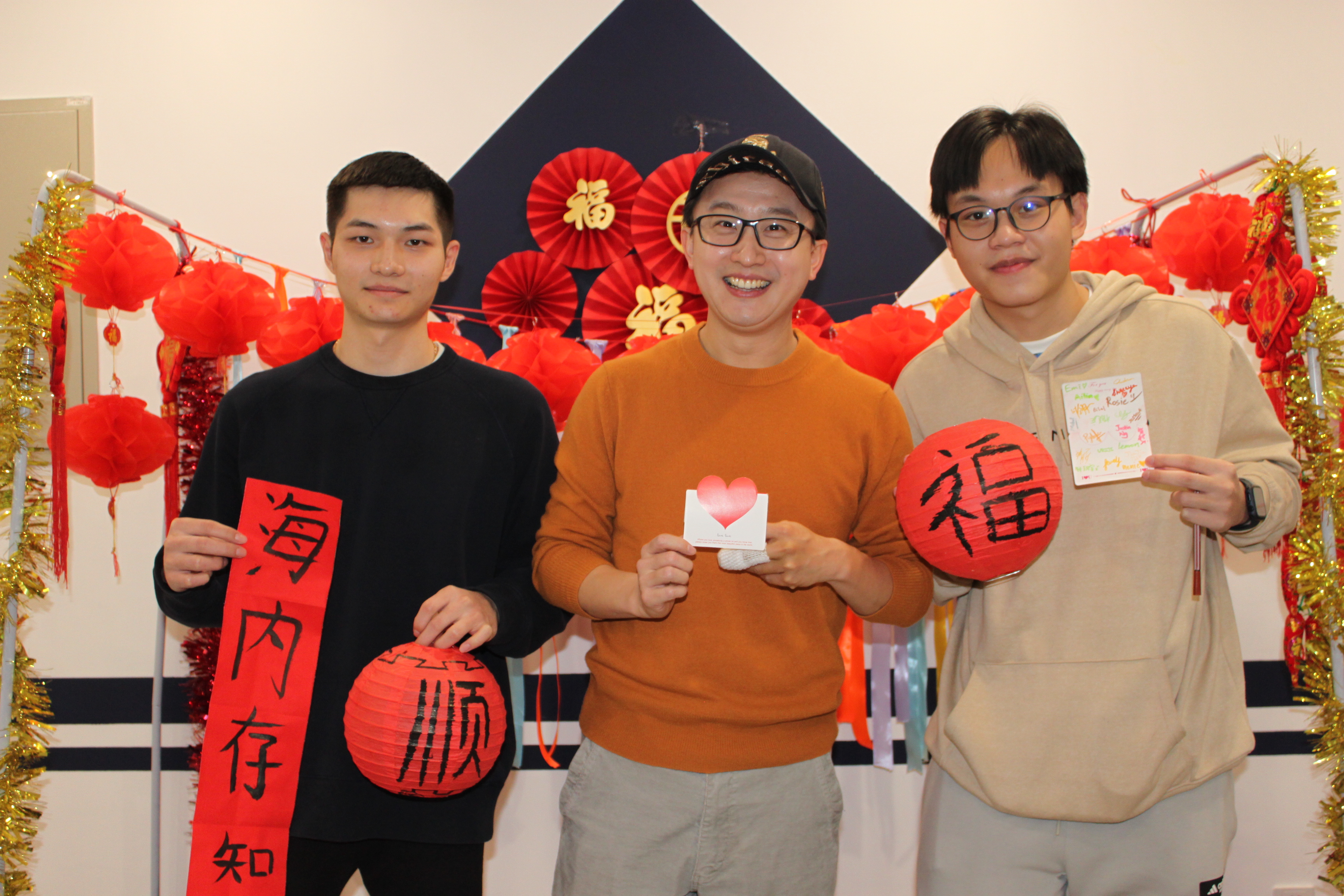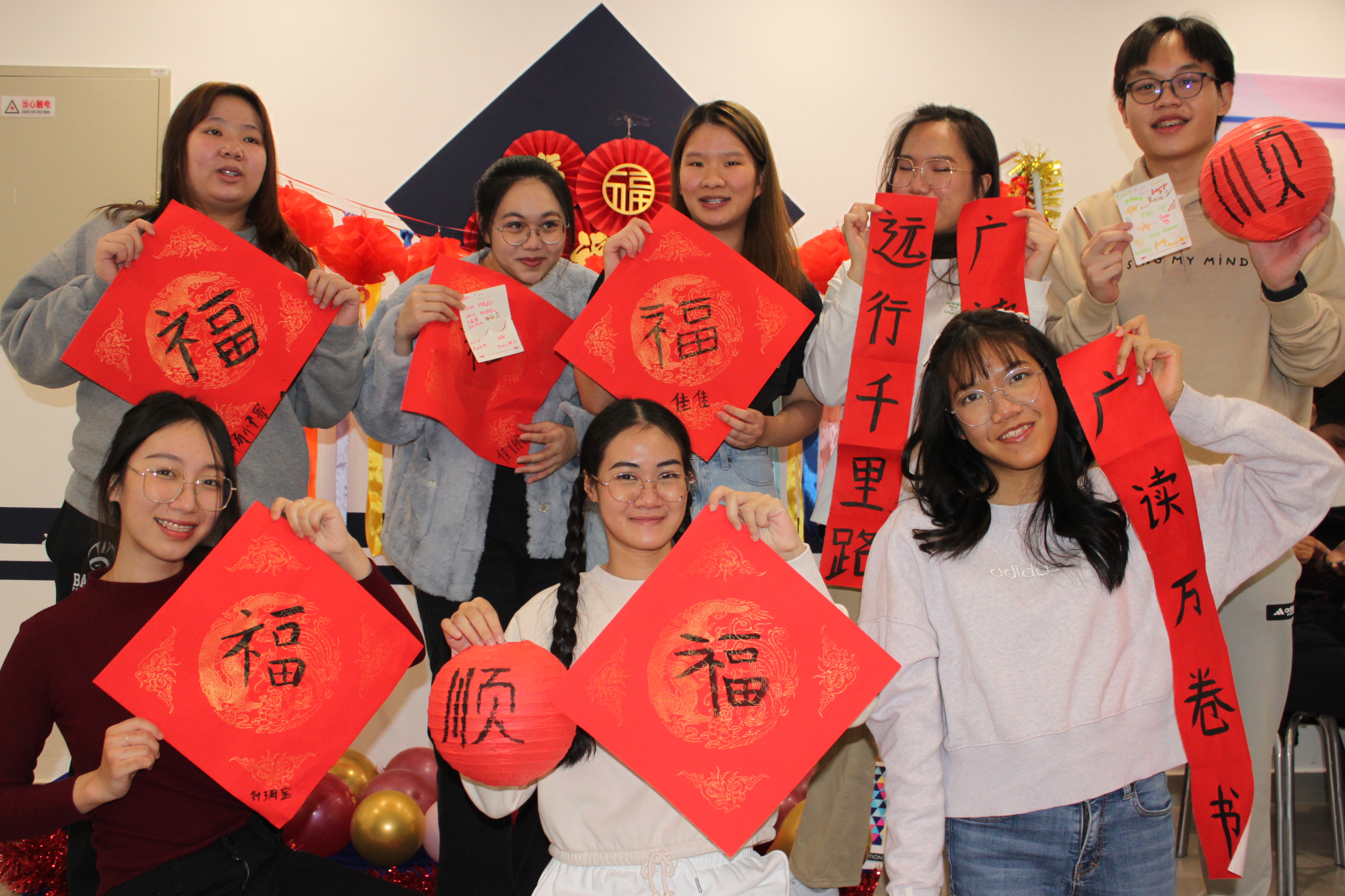 活动第二个环节是制作和描画传统灯笼。大家在灯笼上用毛笔和墨水写下“福”、“顺”、“财”等吉祥的汉字。红红火火,缤纷多彩的春节灯笼搭配上同学们亲手描画的毛笔“福”字和“顺”字,洋溢出浓郁的节日氛围,汉字“福”和“顺”寓意美好,寄托了同学们对新的一年祈求幸福、和顺的美好愿望。
