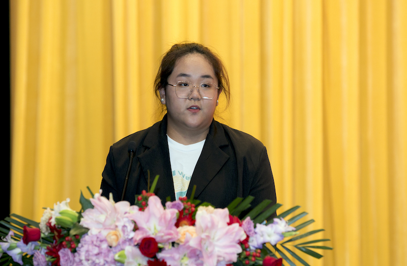 之后,来自合肥市新华公学的邵晓冉同学代表新生发言。邵同学用青春洋溢、掷地有声的演讲鼓励新同学,要不负少年时,在北外国商努力学习语言和专业知识,开启人生新的篇章。