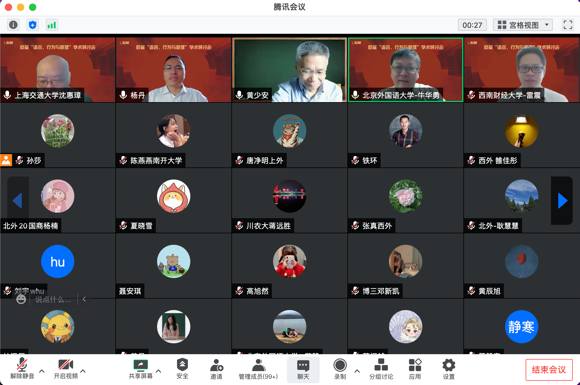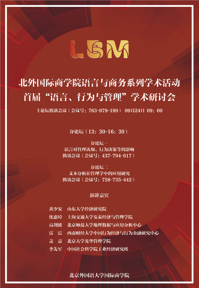 2022年9月24日,由北京外国语大学国际商学院主办的首届“语言、行为与管理”学术研讨会在腾讯会议线上举办。作为我院语言与商务系列学术活动的组成部分,“语言、行为与管理”学术研讨会将持续致力于推动语言学与管理学交叉学科的发展、为国内外学者提供学术沟通与交流平台。