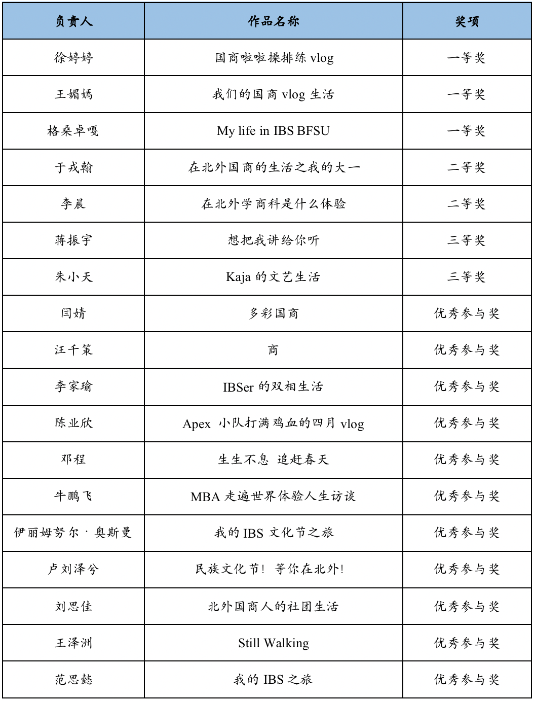 经过重重评审,最终评选出如下获奖作品。其中,徐婷婷组《国商啦啦操排练vlog》、王媚嫣组《我们的国商vlog生活》和格桑卓嘎组《My life in IBS BFSU》获得一等奖。