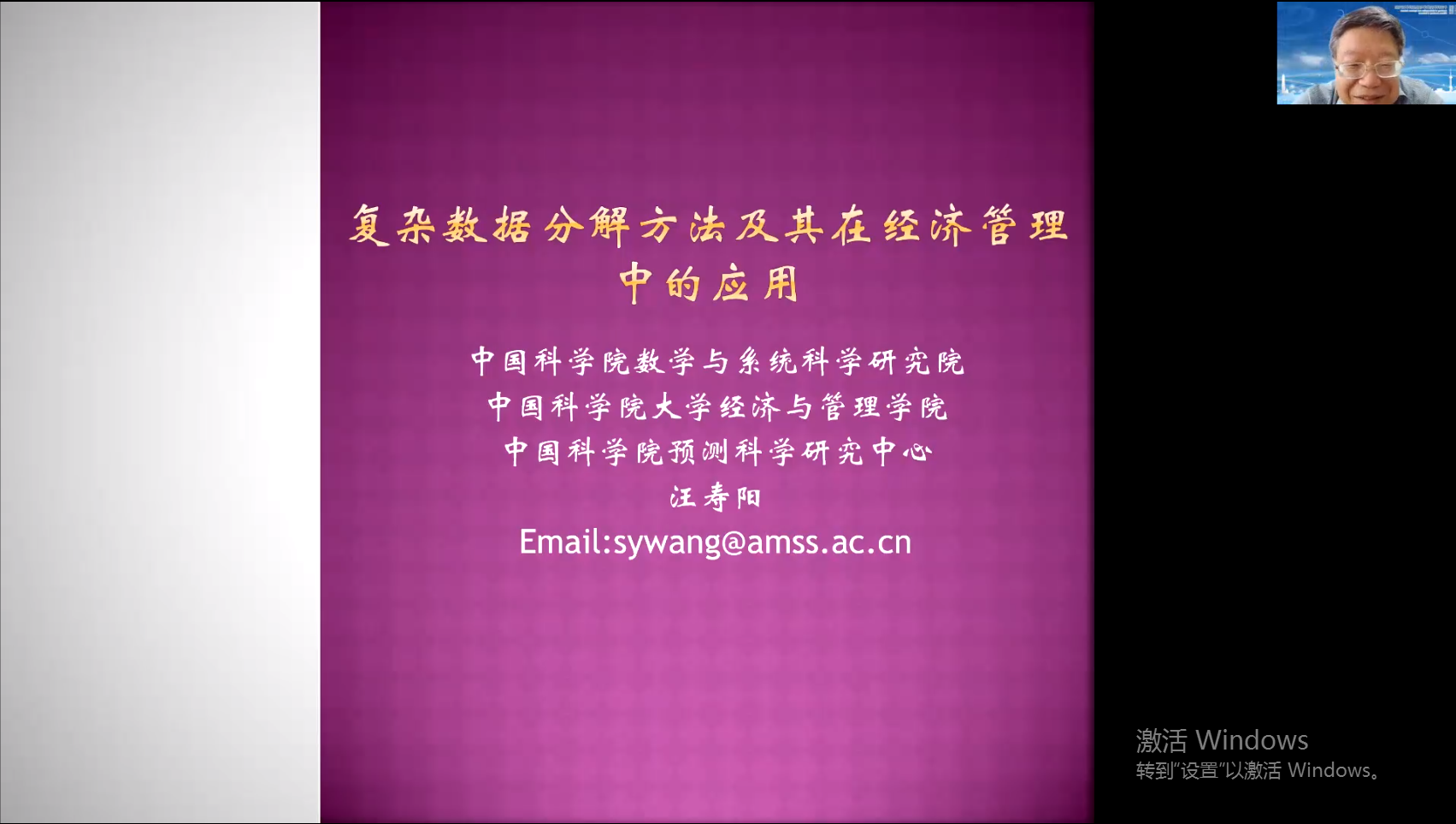 2022年5月31日,北外大讲堂“数据分解方法及其在经济管理中的应用”主题讲座在线上举行,国际商学院教师发展中心和学科建设办公室联合承办,主讲人汪寿阳教授为发展中国家科学院院士、国际系统与控制科学院院士、中国科学院杰出研究员、中国科学院预测科学研究中心主任。