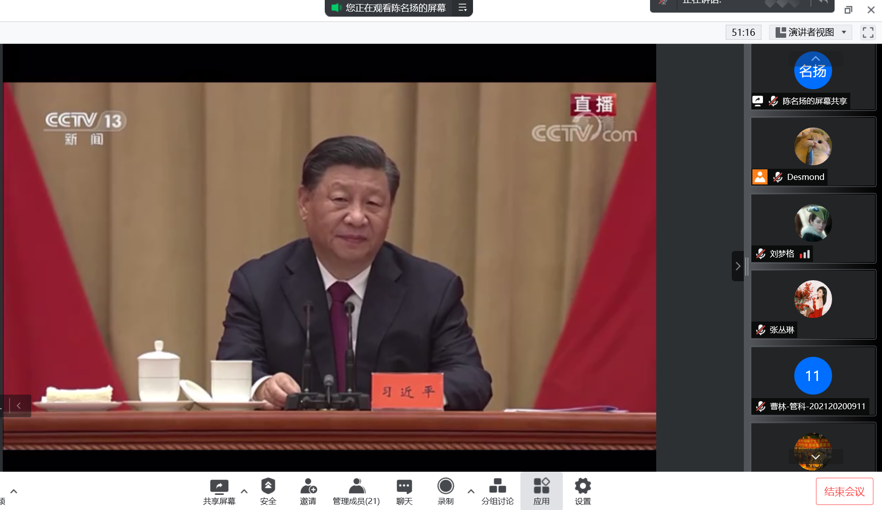 国际商学院研究生团总支学生会的学生骨干们通过腾讯会议的方式集体收看了庆祝大会,并畅谈感想。各团支部也通过多种方式组织团员们观看学习。庆祝大会与总书记重要讲话在团员中引发了强烈反响。