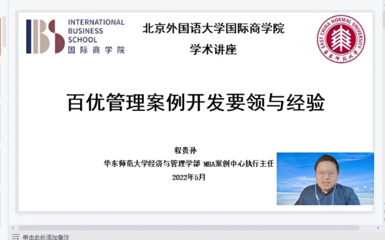2022年5月12日,国际商学院教师发展中心与管理科学与工程系、会计与财务管理系联合举办了百优管理案例开发要领与经验分享会,特邀来自华东师范大学经济与管理学部的程贵孙副教授为师生们线上进行了精彩分享。程贵孙副教授是上海交通大学管理学博士,复旦大学经济学博士后,全国知名管理案例开发专家,现任华东师范大学经济与管理学部MBA案例中心执行主任,兼任“全国百篇优秀管理案例”评审专家、中国工商管理国际案例库评审专家、上海MBA管理案例库特聘评审专家。