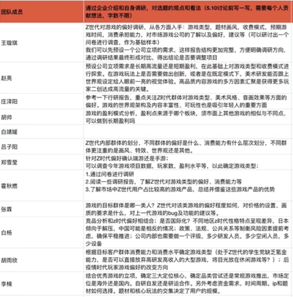 5月10日下午,调研小组的老师及同学齐聚线上,趁热打铁,进行了第一次参访后的小组讨论。在昨日的线上参访结束后,组员们就参访了解到的内容进行思考沉淀,并就各自的思考结论在小组讨论中积极建言献策。会上,同学们积极进行头脑风暴,讨论得出调研方向:以Z世代的偏好为导向,聚焦高品质内容游戏。并就该问题进行细化,从游戏类型、美术风格、推广方式市场范围等角度进行进一步讨论。最后,就讨论的方向进行了数据收集工作的分工,为下一步分析打下基础。
