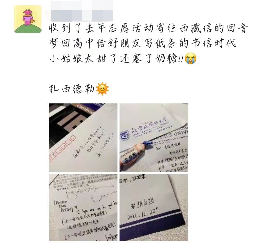 温暖的流动从来不是单向的,真挚的情感虽远隔千里也能从薄薄的信纸上跃然而出。在收到西藏小伙伴们的回信之后,我们的志愿者们同样激动和愉悦,纷纷自发在社交平台上分享感动、传递温暖,获得许多国商同学们的点赞和回复,反响十分积极热烈。