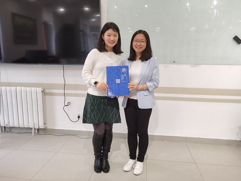 分享会开始,文雯老师向郭婧女士颁发了“校友导师”聘书,感谢校友回母校与学弟学妹们分享职场经验和人生感悟,助力在校生的职业成长和全面发展。