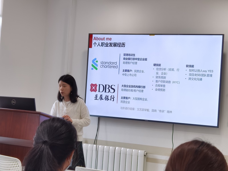 4月10日,国际商学院举行“实践型学习项目”之“职业生涯规划”活动,邀请到2007级校友,现任星展银行(有限公司)北京分行副总裁的郭婧女士,为同学们进行了主题为“外资银行发展路径及心得分享”的分享会。分享会由国内合作办公室副主任文雯老师主持。
