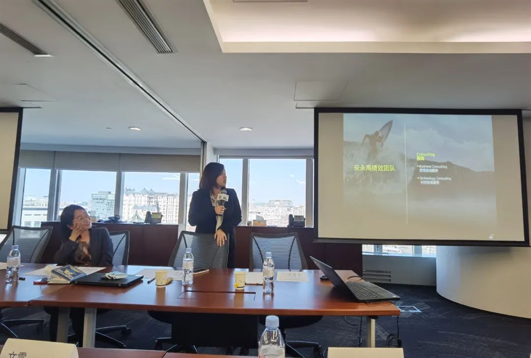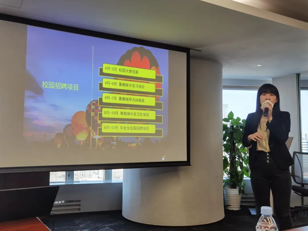 参观过后,交流活动开始。首先,安永校园招聘代表Monica Li对老师们的到来表示热烈欢迎。安永华北区金融服务主管合伙人Xiaodong Zhang为老师们介绍了公司发展状况、覆盖业务范围等等,帮助老师们更深刻地了解到安永的多元、平等与共融。