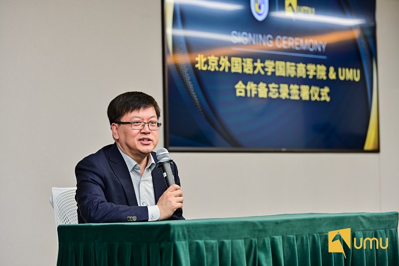 仪式开始,牛华勇院长表示,UMU 是北外国商学院学生参访过的企业中最受学生欢迎和喜爱的公司之一,十分感谢 UMU 为国际商学院师生提供的机会和帮助。走进行业对学生的个人发展至关重要,希望未来以行业为核心构建更多实践平台,让同学们近距离体验职场,感受企业家精神,提升个人独立自主的能力,成为对家庭、对社会有用的人。国际商学院期待在未来与UMU进行学生实践、人才培养、产学研融合等方面进行全方位深入的合作。