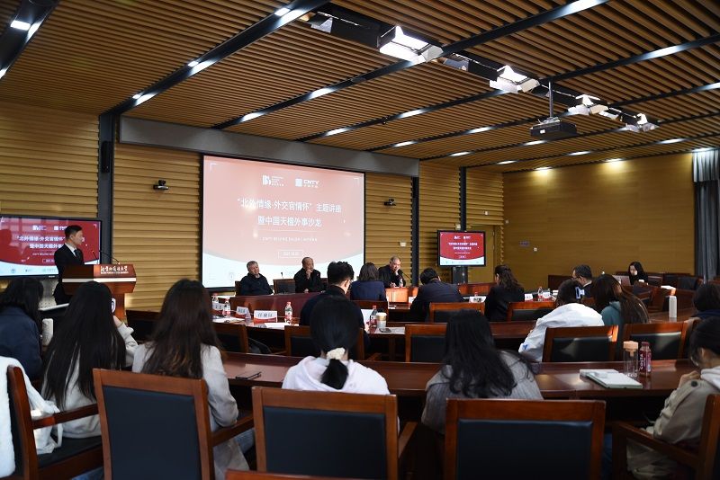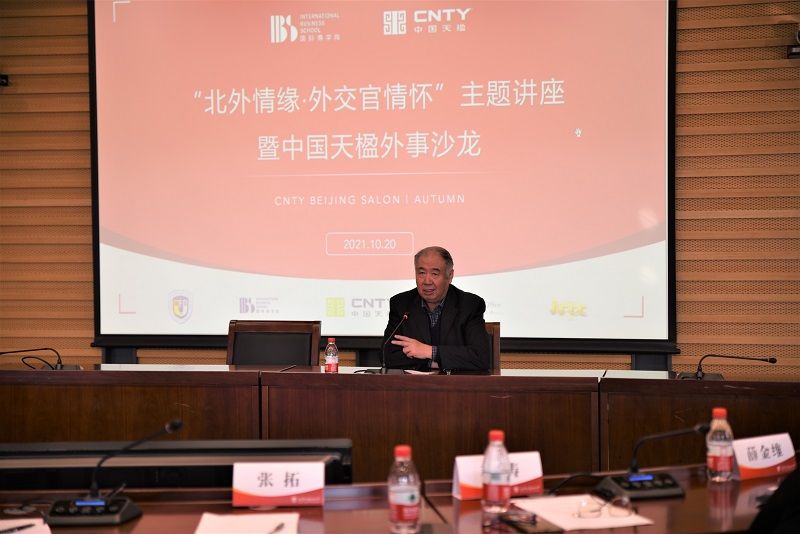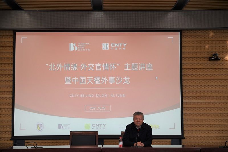 签约仪式后,“北外情缘·外交官情怀”主题讲座暨中国天楹外事沙龙活动正式开始。首先,郑清典大使发表了致辞,对于北京外国语大学国际商学院和中国天楹股份有限公司成功签约表示祝贺。程涛大使、张拓大使和薛金维大使作为北外的校友,一一分享了他们对于北外的回忆,以及他们外交生涯的经历和感悟,同学们认真聆听了讲座,并被外交官们的家国情怀深深感动。