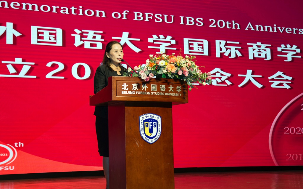 李春丽代表学院向老领导、老同志致以崇高敬意和慰问,向全院师生、海内外校友致以最热烈的祝贺,向长期支持、关注、关爱商学院建设的领导、兄弟学院的同仁和社会各界人士致以诚挚的感谢。她指出,在教育部、北京市教育主管部门和学校党委的领导下,20年来,国际商学院始终坚守立德树人初心,履行为党育人、为国育才使命,大力加强学科建设,不断创新人才培养模式和提高人才培养质量,办学实力和影响力持续提升,经过不懈努力,今天的国际商学院已成为北外办学规模最大的学院。前瞻、进取、包容、多样化,是北外国商的性格,共同价值和共同愿景是北外国商的基石;学院始终与祖国共命运,与时代同前进,以开阔的全球化视野,孕育远见,激发潜能,致力于培养具备全球胜任力的国际化经济管理人才,服务于中国和全球经济发展。近年来,学院不断探索复合型人才培养的方法、路径,依托北外高水平外语学科优势,与俄语学院、德语学院、法语学院、亚洲学院、欧语学院、西葡语学院、专用英语学院等兄弟学院携手,开展跨院系合作,培养复合型国际化人才,并取得积极成果。国际商学院有一支具备理想信念、道德情操和扎实学识、仁爱之心的高素质教师队伍,他们是学生成长的引路人。学院的发展离不开社会力量的大力支持。近年来,学院深挖育人资源,在学生实践、人才培养、产学研融合等方面与企业开展深度合作,聘请企业高管担任业界导师,共同探索创新型人才培养的新模式。