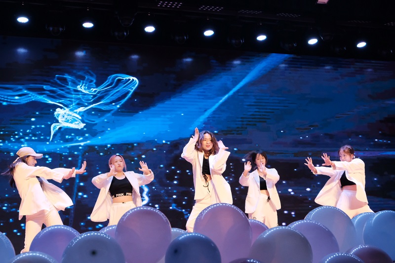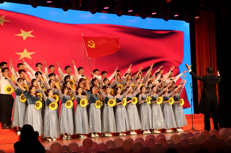 青春与律动结合,色彩和美感交叠。联欢会伊始,灯光聚焦,帷幕拉开,映入眼帘的是国商师生合唱团。五星红旗的背景下,国商学子唱响《唱支山歌给党听》,庄重而深情地向党告白。晚会在热烈的氛围中拉开帷幕。