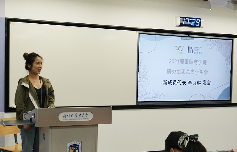 随后,2021届研究生团总支学生会新成员代表李诗琳发言,分享了自己加入研会的初衷,并表达了对加入研会后工作的憧憬和期待。