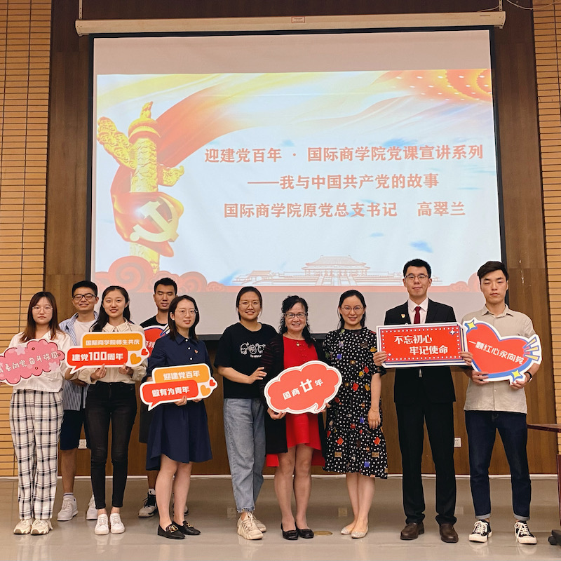 随后,高翠兰老师和学生党员们分享了她的求学与工作历程。她重点讲述了在北外英语学院以及国际商学院任教的经历,回忆起当年在国商的青葱岁月,高老师感慨万分,并寄语国商:忆往昔,岁月峥嵘;展未来,万事可期。她还提到国商学子们都思有理性、行有韧性,具有自己独特的魅力与优势,希望同学们今后都能在各自的岗位上发光发热。