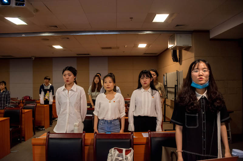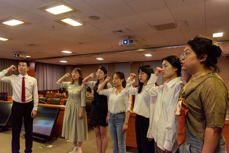 会议的最后党支部本次发展转正全体成员在书记的领读下面对党旗对党宣誓,宣誓结束后党支部与会人员合唱国歌,大会至此圆满结束。