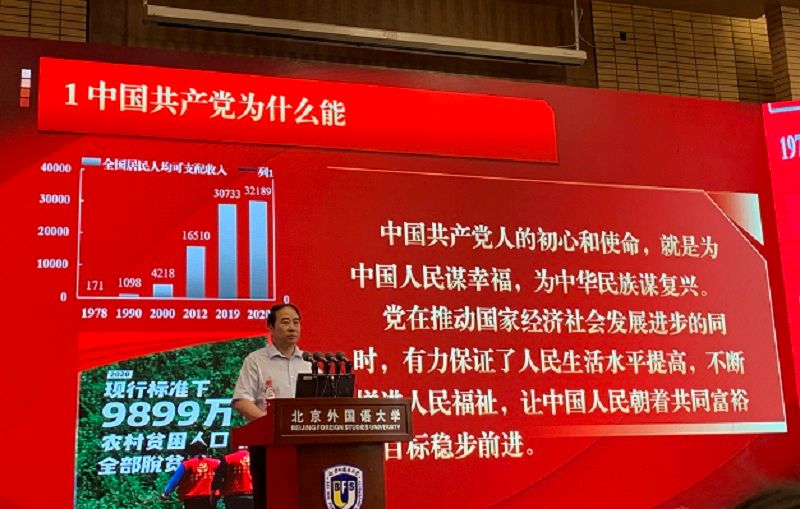在场的国商师生表示,王定华书记的专题党课,是一堂思想深刻、内容生动、针对性强、富有启发的思政课。王定华书记为此次党课做了精心的准备和设计,收集大量详实的资料,结合自身经历,采用照片、数据和视频等多种形式讲授内容,还有与同学们的交流互动,使得党课十分引入入胜。课间,北外大学生艺术团讲演队表演了精彩的诗歌朗诵《盛世中国——献给伟大的中国共产党成立100周年》;党课在全体师生齐声合唱校歌《永远为人民服务》的歌声中结束,整个党课高潮迭起,气氛活跃,催人奋进,给在场的师生留下了深刻的印象。