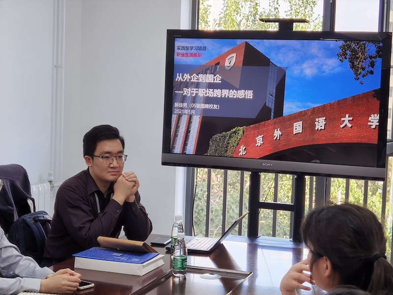 5月26日,国际商学院举行“实践型学习项目”之“职业生涯规划”活动,邀请到2005级校友,现任中国中信集团有限公司董事会办公室经理的解佳男先生,为同学们进行了主题为“从外企到国企:对于职场跨界的感悟”的分享会。分享会由本科生教务与教学办公室胡诗伟老师主持。