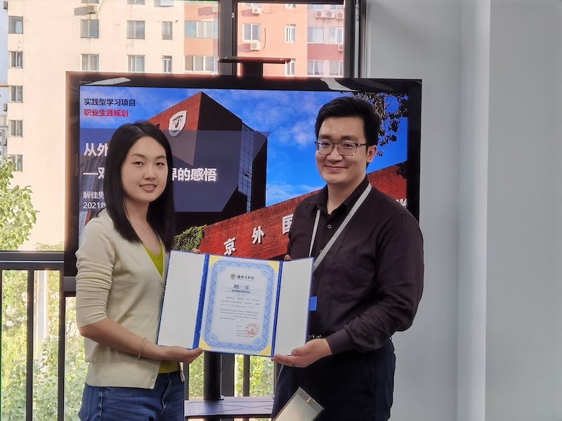 分享会开始,胡诗伟向解佳男先生颁发了“校友导师”聘书,感谢校友回母校与学弟学妹们分享职场经验和人生感悟,助力在校生的职业成长和全面发展。