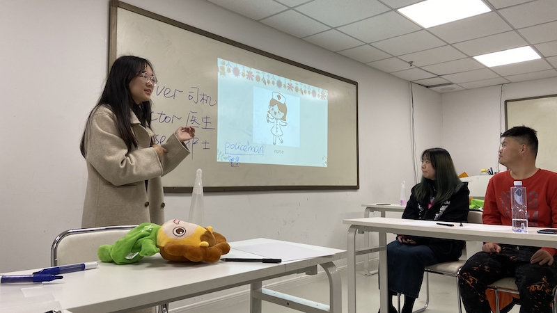 4月22日下午,国际商学院研究生团总支一行5人赴知春大厦进行本学期第一次英语课堂的活动。为大孩子们取了各自的英文名,讲授了新朋友见面时的打招呼方式,教授了10个常见的职业的英文表达,并进行了情景模拟。