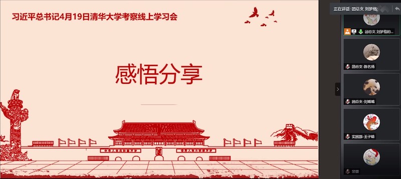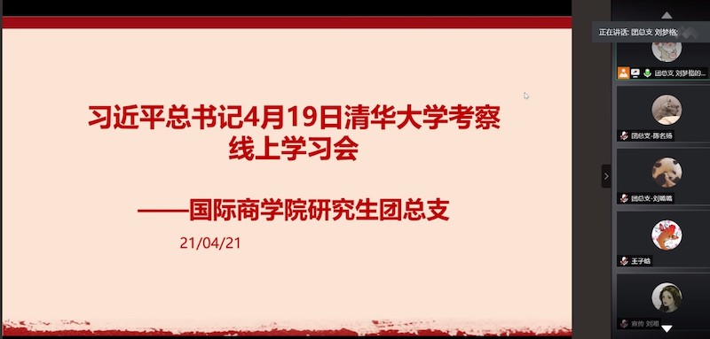 为动员广大青年团员认真学习习近平总书记重要讲话精神,4月21日下午,北京外国语大学国际商学院研究生团总支学生会通过腾讯会议举办了习近平总书记考察清华大学重要讲话学习分享会,学院研究生会各部门、20级硕士研究生各班均参加了此次学习。