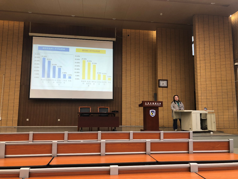 本次讲座聚焦就业趋势环境以及学生就业特点两个方面。首先,北外就业创业中心方卉老师对就业政策以及学校整体就业趋势进行了全面介绍,分析了近五年中国高校毕业生人数的变化趋势。方卉老师鼓励国商同学更加积极主动地利用北外就业创业中心提供的平台信息和咨询途径,深入了解和比较不同择业方向的利弊优劣。随后,方卉老师对求职流程进行了细致梳理,并且在起薪期望、城市选择、工作单位性质、落户政策等方面给出建议。