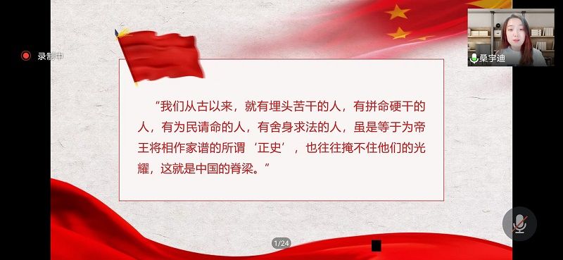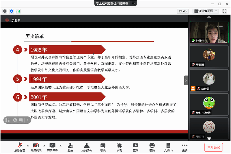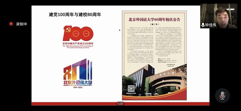 本次活动的宣讲人分别是会计系学生党支部的桑宇迪同志和金融系学生党支部的钟佳伟同志。在宣讲活动中,桑宇迪同志详细介绍了北外的发展沿革。从延安走来的北外与共和国一同成长,服务于中国工业化发展的翻译与沟通工作,助力于中国外交事业的发展。展望未来,北外人将一直为祖国的现代化建设做贡献,维护祖国形象,传承“人民需要我们到哪里,我们就到哪里”的北外精神。此外,钟佳伟同志介绍了北外发展历史中的几个重要时间节点,并从北外学科建设和专业设置角度印证了北外坚定服务于国家发展战略的决心和努力,最后通过讲述北外校友、教师的事迹来鼓舞新时代北外人继续肩负青春使命,传承北外红色基因。