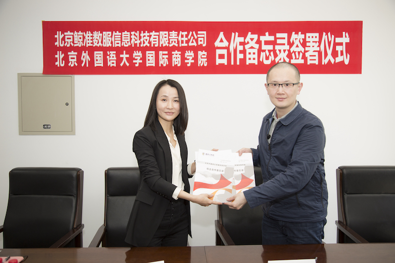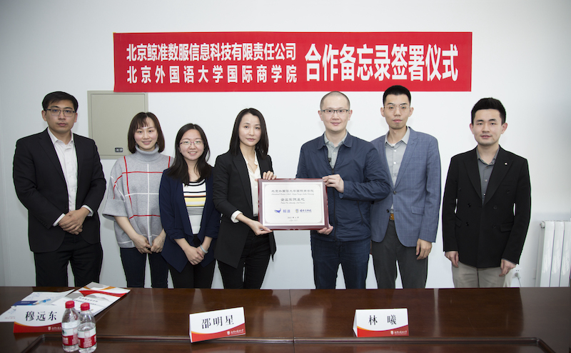 出席签约仪式的还有:北京鲸准数服信息科技有限责任公司产业运营负责人谭皓夫、企业运营负责人钱宇航,北京外国语大学国际商学院金融系教师穆远东及国内合作办公室事务主管陈钰茜。