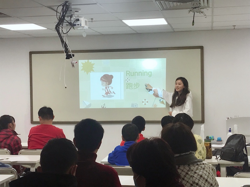 在第二节课,志愿者带领学员们走入动物世界,通过动画形式认识了一个个小动物。在“谁不见了”的游戏环节中,志愿者和学员们模仿动物的叫声,分别找出两幅图片中消失的动物。而后,志愿者们就课堂涉及的单词进行了拼写练习,并对本学期的课程主题进行了梳理和复习,从26个字母和数字,到水果、日常运动以及动物的英文表达,多数学员能够较好地掌握所学内容。