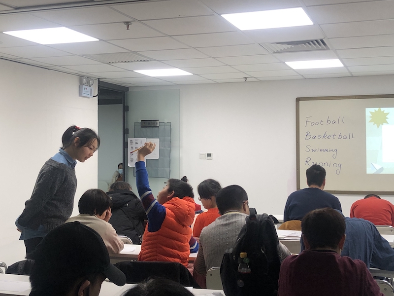 志愿者们首先对上周所学的“水果”内容进行了回顾,学员们表现积极,能够流利说出对应单词。随后,志愿者和学员们一起学习了有关运动的表达,从足球篮球到游泳跑步,学员们依次分享了自己最喜欢的运动方式。在“你做我猜”的游戏环节中,5位志愿者模仿日常运动的动作,采取互动抢答的形式以加深学员对单词的记忆。