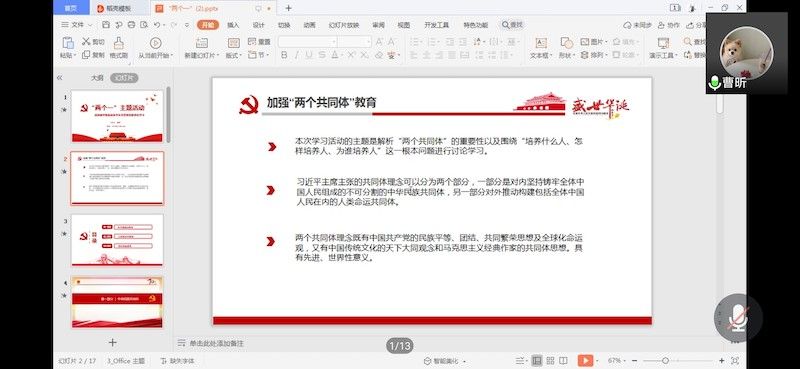 本次“两个一”主题活动由以“回望2020”为主题的党日活动和以“加强两个‘共同体’教育”为主题的创新理论学习活动两部分组成。首先,各学生党支部书记通过一系列文字和图片资料向支部党员回顾了2020年以来的工作开展情况,梳理了下一阶段的工作目标与思路,并提出对未来支部建设的期许与展望。在互动交流环节,与会党员认真反思、积极发言,就个人在疫情防控、日常生活、学习实践等方面进行了深刻的工作总结与自我批评,切实剖析自身存在的问题与不足,总结经验,砥砺前行。