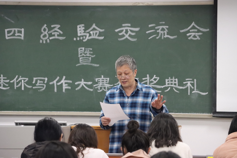 12月9日16:00,国际商学院专四经验交流会暨英语迷你写作大赛颁奖典礼于逸夫楼405顺利举行。专用英语学院教师陆幼麟,国际商学院本科生团总支书记王瑞雪、20级辅导员华蕾出席本次交流会。