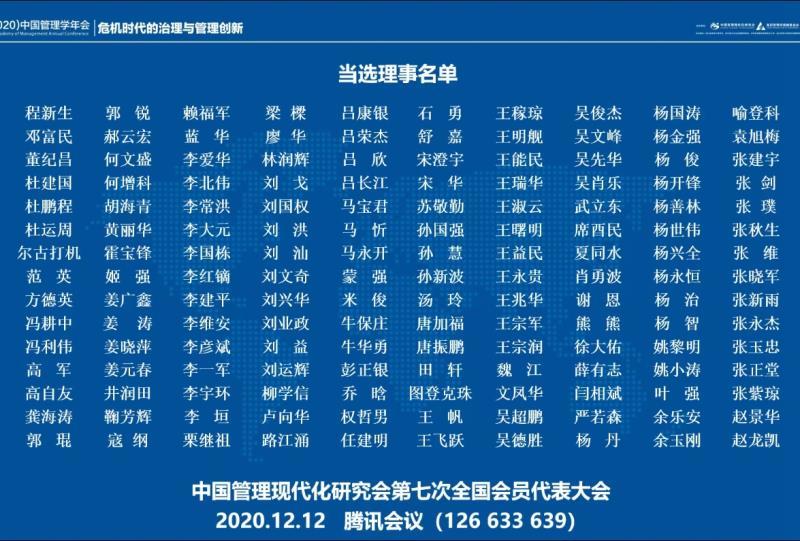 12月12日,中国管理大会在线上举行,来自全国的几百名名学者专家参加了会议。会议进行了中国管理现代化研究会理事换届选举。我校校长杨丹教授当选研究会副理事长,我院院长牛华勇教授当选研究会理事。