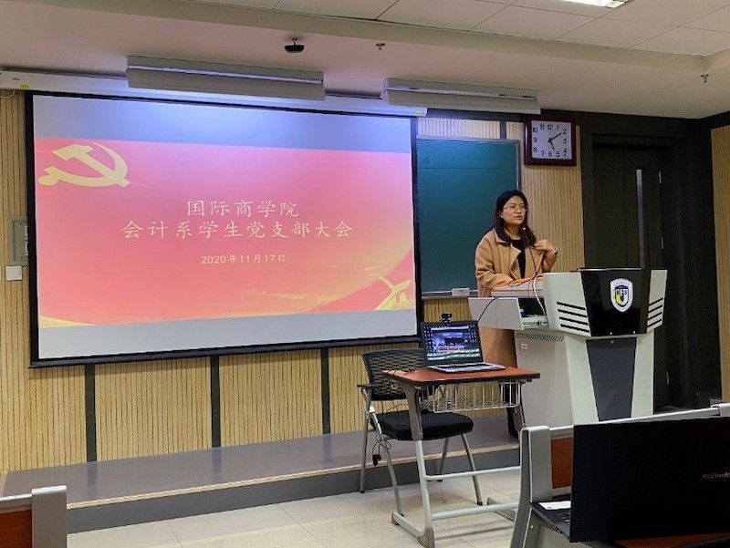 2020年11月17日,北京外国语大学国际商学院会计系学生党支部大会于综合楼513召开,国际商学院学生事务办公室谭佳琳老师莅临发表讲话。谭老师指出,身为党的一份子,大家应更积极主动地参加活动,承担起该有的责任和义务,同时贯彻落实好习总书记“不忘初心、牢记使命”的号召,做好身边事。