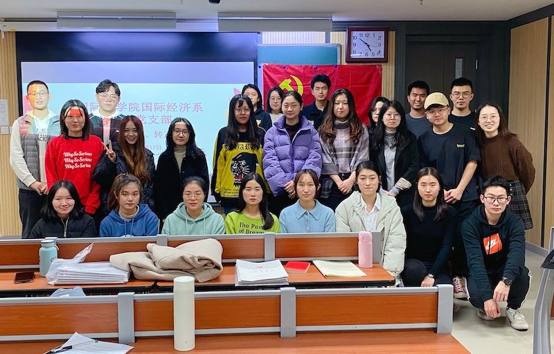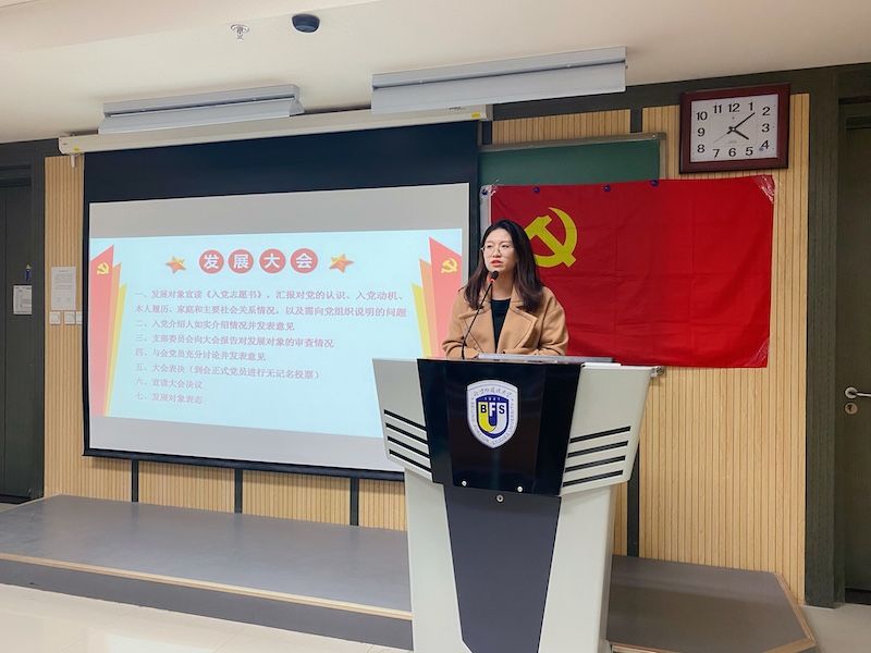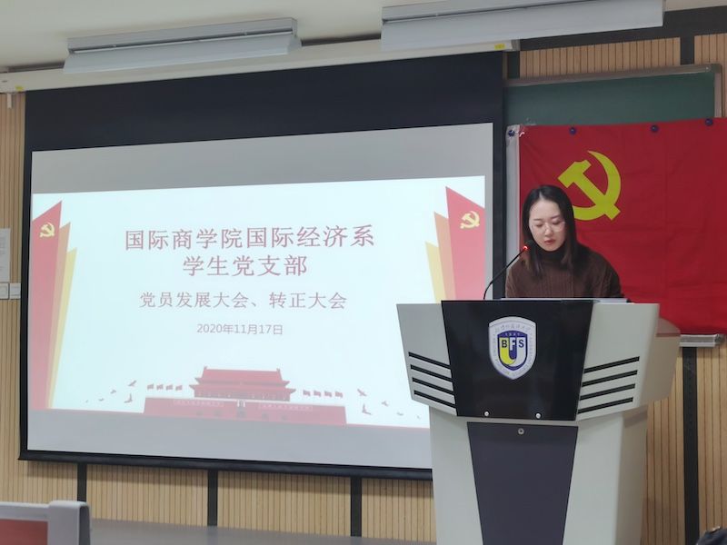 2020年11月17日下午,国际商学院国际经济系学生党支部于国际大厦409召开党员发展及预备党员转正大会,讨论关于李向晴,毕煜晗,吴思遥,朱郁贤,杨黔,李楠6位发展对象转为预备党员的问题,以及陈名扬、朱栎璇两位预备党员转正式党员的问题。本次大会由国际经济系学生党支部书记杜倩同志主持,学校党委组织部组织员林普华老师,学院学生事务办公室谭佳琳老师出席大会。应到会有表决权党员20人,实到会有表决权党员16人,超过本支部有表决权党员半数以上,符合规定人数,可以开会。在清点与会人员并宣布到场情况后,与会人员合唱国际歌。发展对象分别宣读《入党志愿书》,汇报对党的认识、入党动机等。由入党介绍人介绍发展对象的基本情况,并发表意见。支部委员会向大会报告发展对象的审查情况及公示情况。