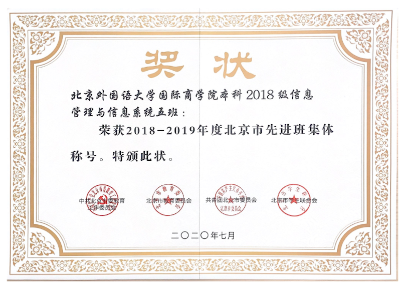 2020年7月,2018-2019年度“北京市先进班集体”评选工作落下帷幕。经我校各学院党委、校团委审核推荐,团市委、市委教育工委、市教委、市学联复核评定,我院2018级信管5班在评选活动中取得优异成绩,荣获“北京市先进班集体”称号。
