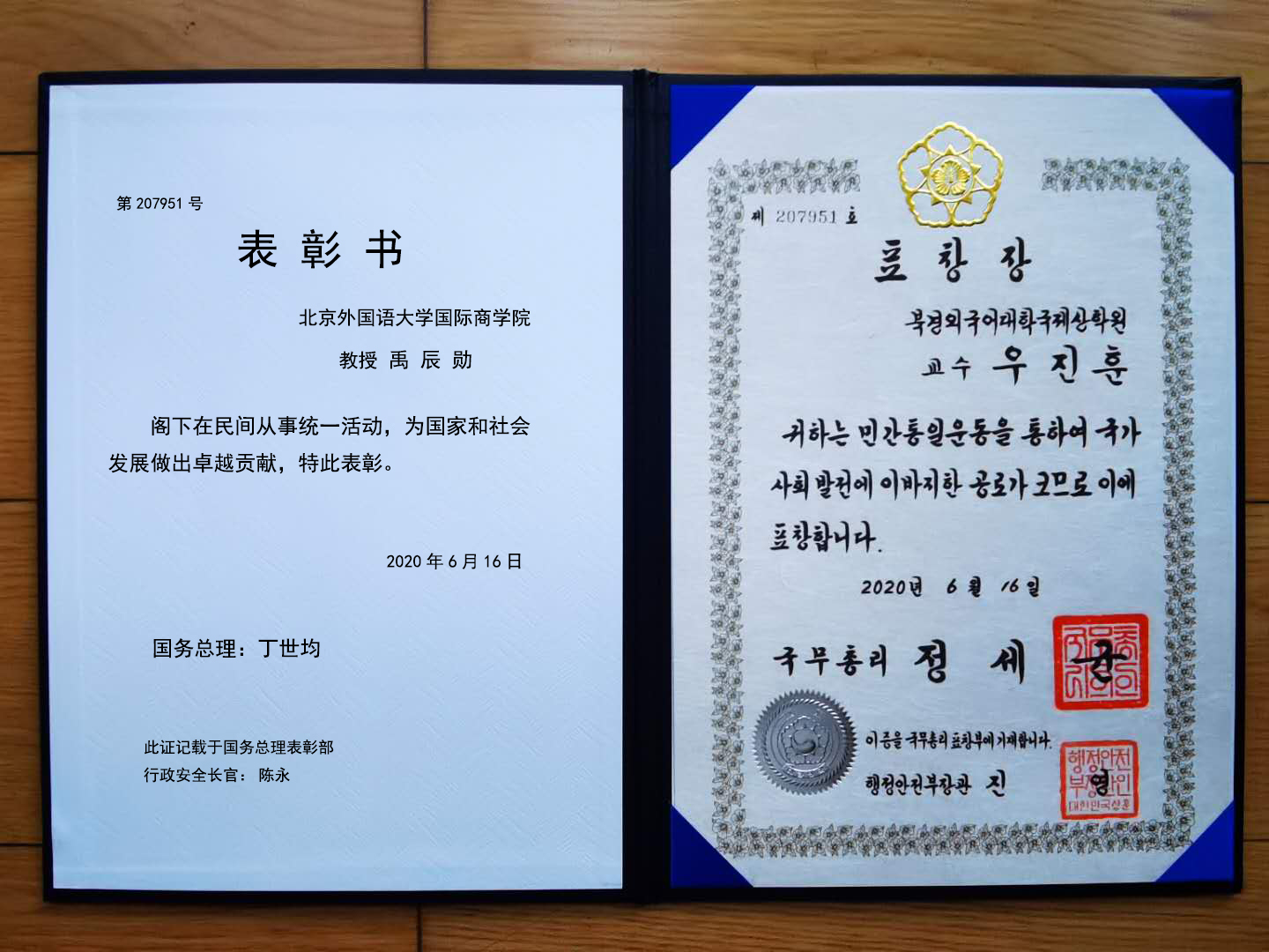 韩国总理奖主要授予在各个领域有突出贡献的人士和团体,此奖由韩国政府颁发,是韩国最有影响力的社会性奖励之一。禹辰勋教授于1991年中国结缘,于2017年获聘为我校国际商学院客座教授,与国际商学院师生合作在中韩经济与贸易发展方面进行了大量研究,在推动我校承办中日韩区域合作与发展论坛、东北亚经济与管理合作论坛等方面做出了诸多努力。他目睹了中国近30年来的快速发展,也见证了中国改革开放的历程。禹辰勋教授表示,今后将继续努力推动中韩各界加强交流、增进友谊、扩大合作,为两国交流做出积极贡献,全力以赴为新的中韩关系定位竭尽绵薄之力。