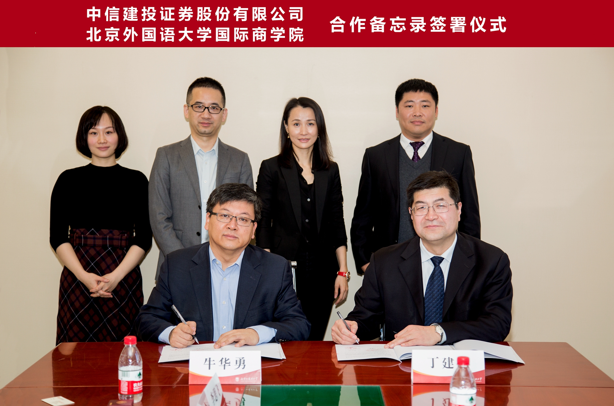 1月14日,北京外国语大学国际商学院与中信建投证券股份有限公司签署了战略合作备忘录,并向中信建投证券股份有限公司颁授“北京外国语大学国际商学院企业实践基地”牌匾。本次合作意味着双方即将在学生实践、人才培养、产学研融合等方面进行全方位的合作。中信建投证券执委、合规总监丁建强、中信建投证券法律合规部高级副总裁翁航、北京外国语大学国际商学院院长、党总支副书记牛华勇,副院长邵明星等参加签约仪式,仪式由国际商学院国内合作办公室副主任李思飞主持。