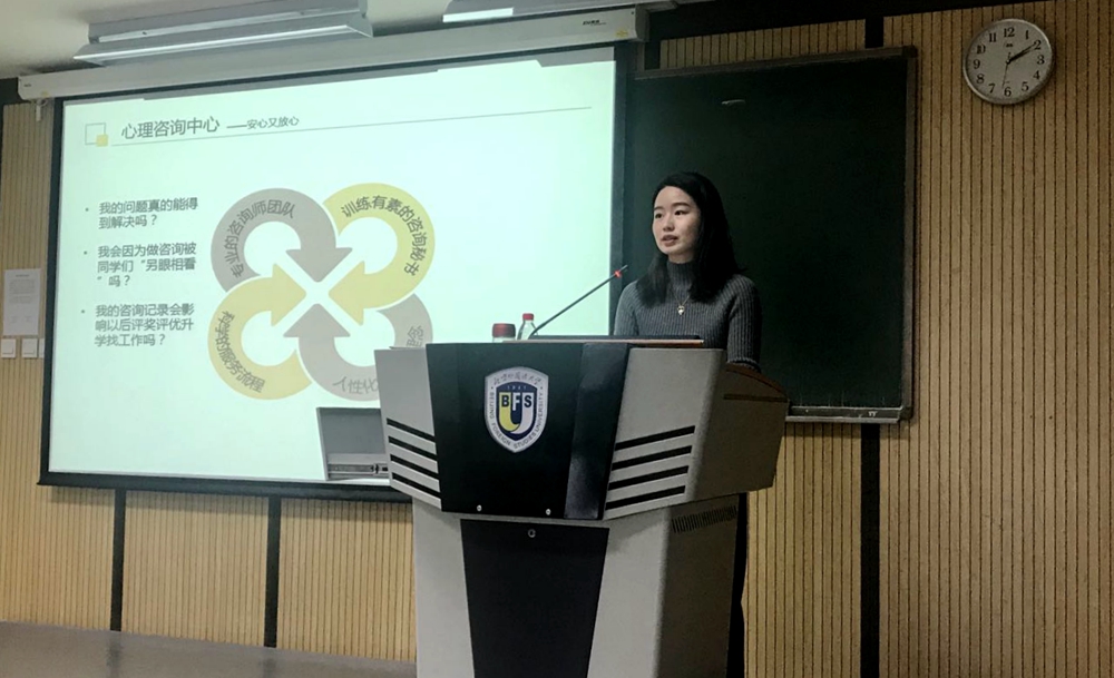 2019年11月17日下午,由国际商学院研究生会主办的 “心灵直通车”系列心理讲座第三期在国际大厦405教室顺利举行。本期讲座的主讲嘉宾为北外国际商学院研究生赵雪延,讲座主题为“我在心理咨询中心的那些年—工作体验与心得体会”,国际商学院本科生、研究生各班心理委员及其他感兴趣的同学共50余人到场参加。