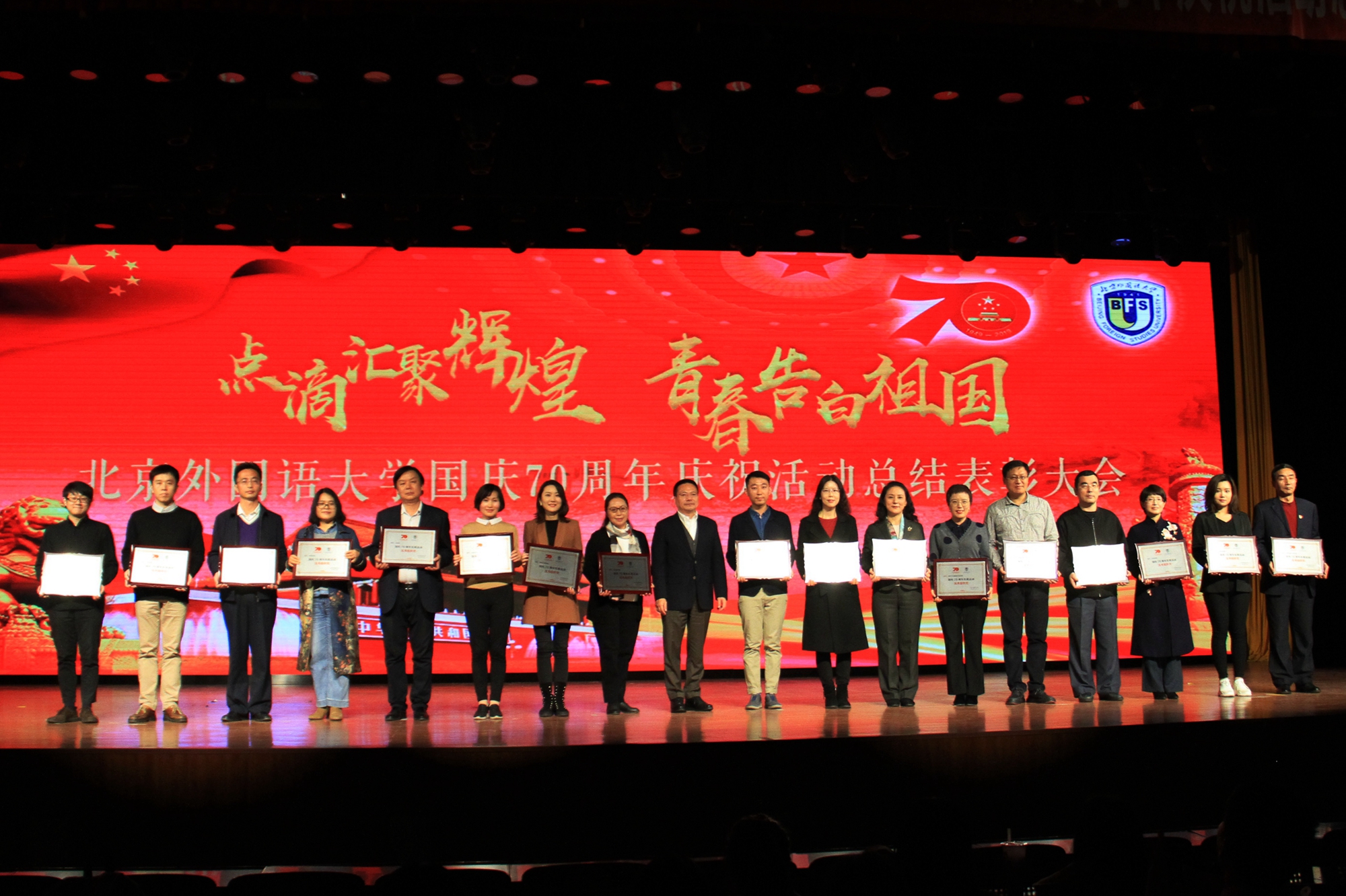 10月30日,“点滴汇聚辉煌,青春告白祖国”——北京外国语大学国庆70周年庆祝活动总结表彰大会在东校区千人礼堂隆重举行。学校授予国际商学院“北京外国语大学国庆70周年庆祝活动优秀组织奖”,国际商学院党总支书记李春丽代表学院上台领奖。授予邓会荟等4人北京外国语大学国庆70周年庆祝活动“先进工作者”称号;授予巴特等12人北京外国语大学国庆70周年庆祝活动“先进个人”称号;授予曾冠华等82人北京外国语大学国庆70周年庆祝活动“优秀志愿者”称号。