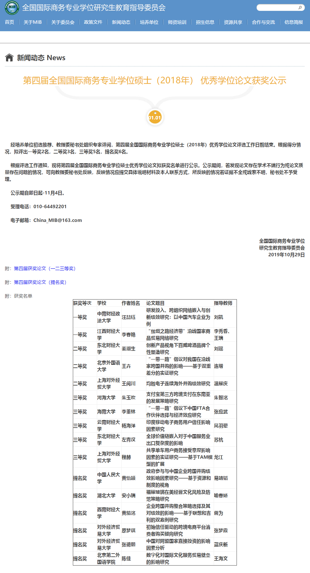 10月29日,全国国际商务专业学位研究生教育指导委员会公示了第四届全国国际商务专业学位硕士(2018年) 优秀学位论文。由我院2016级国际商务硕士王卉撰写,国际经济系教师连增指导的 《“一带一路”倡议对我国在沿线家跨国并购的影响——基于双重差分的实证研究》荣获二等奖。