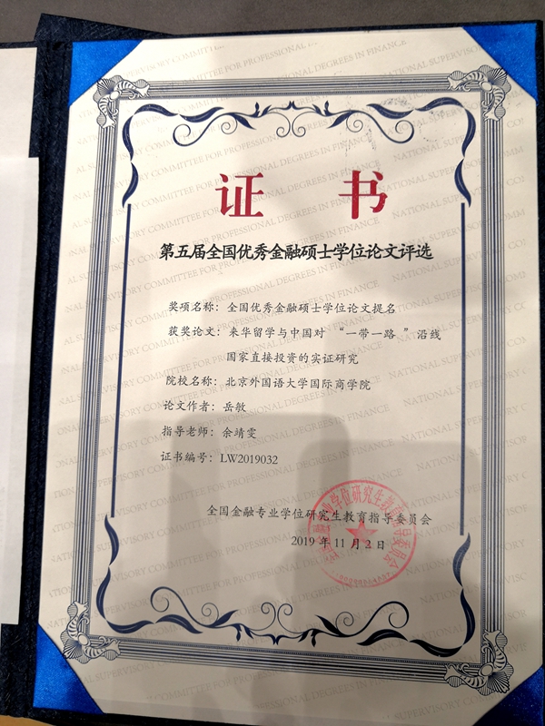 11月2日,在全国金融专业学位研究生教育指导委员会举办的第五届全国优秀金融硕士学位论文评选中。由我院2016级金融硕士岳敏撰写,金融系教师余靖雯指导的 《来华留学与中国对“一带一路”沿线国家直接投资的实证研究》荣获提名奖。