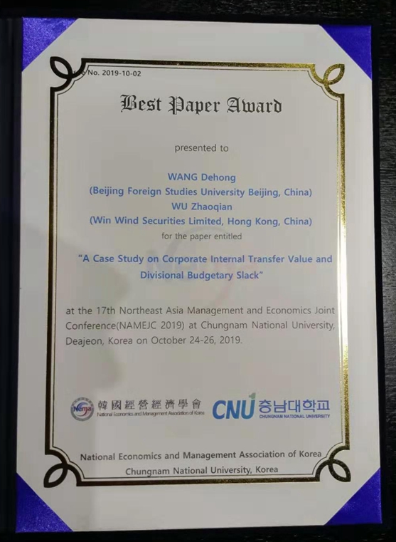 10月24日至26日,由韩国国家经营经济学会主办、韩国国立忠南大学承办的第17届东北亚管理与经济合作会议上,我院教师王德宏撰写的 "A Case Study on Corporate Internal Transfer Value and Divisional Budgetary Slack" 获得了大会最佳论文奖。