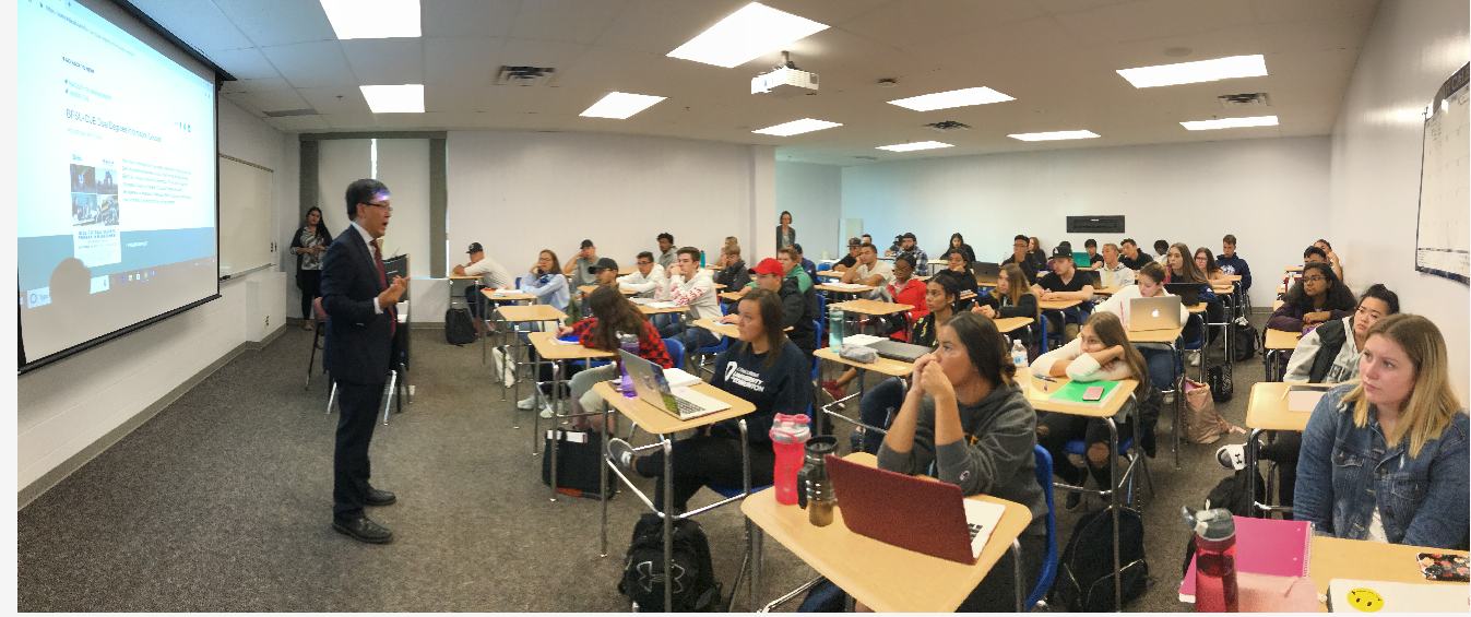18日中午,牛华勇为埃德蒙顿康考迪亚大学的师生带来了关于北京外国语大学的专题演讲。下午,牛华勇分别为四个班的学生进行了关于“1+2+1双学位项目”的宣讲。会上,牛华勇对学生们比较感兴趣的入学要求、专业、住宿、学生活动等进行了深入介绍。
