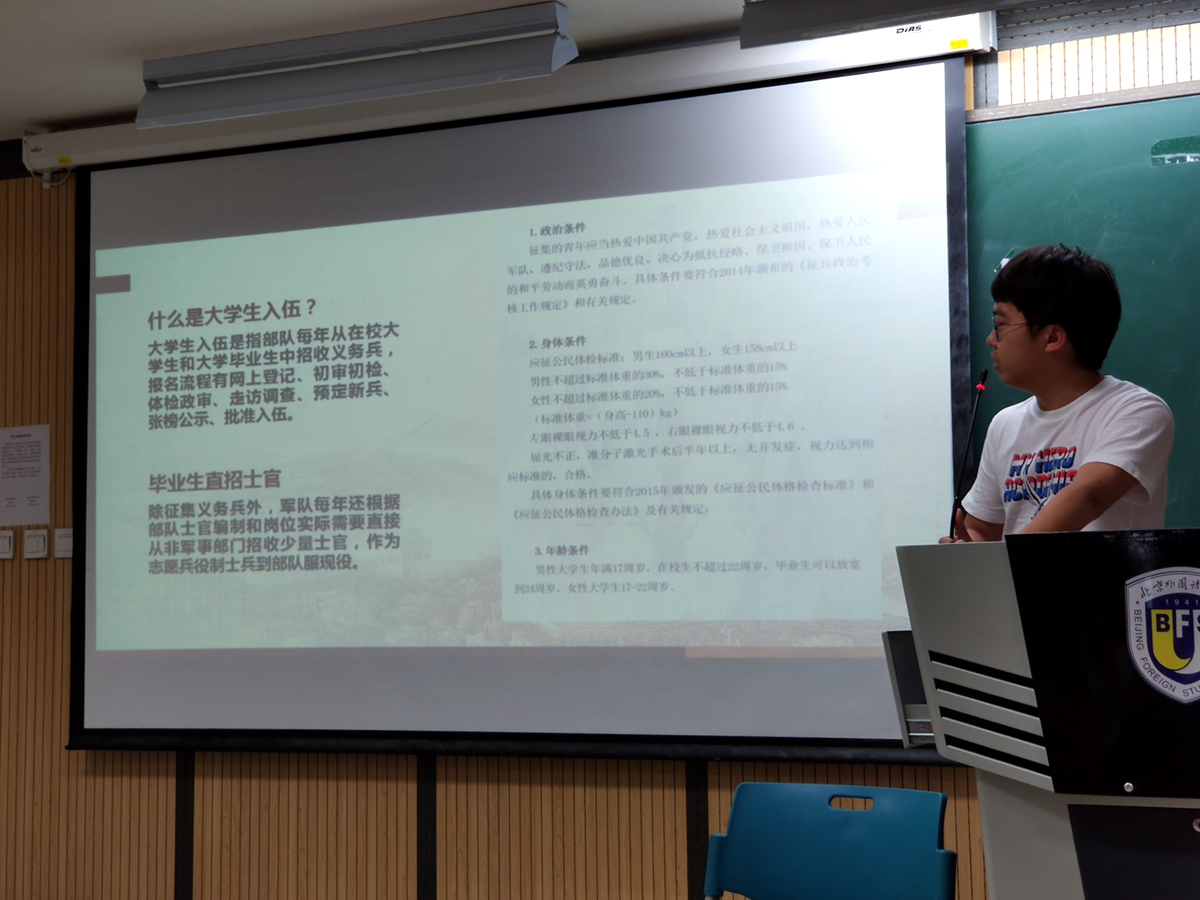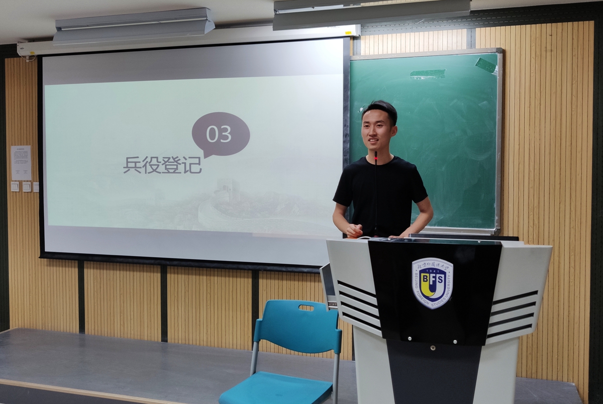 5月29日下午18:00,国际商学院2019年度征兵工作动员大会在西院综合楼309教室召开。会议由2018级本科生辅导员、学院兵役领导小组联络员王米川主持,14级优秀退役大学生士兵高家俊和17、18级全体男学生及部分女学生参会。