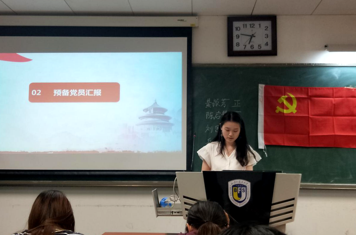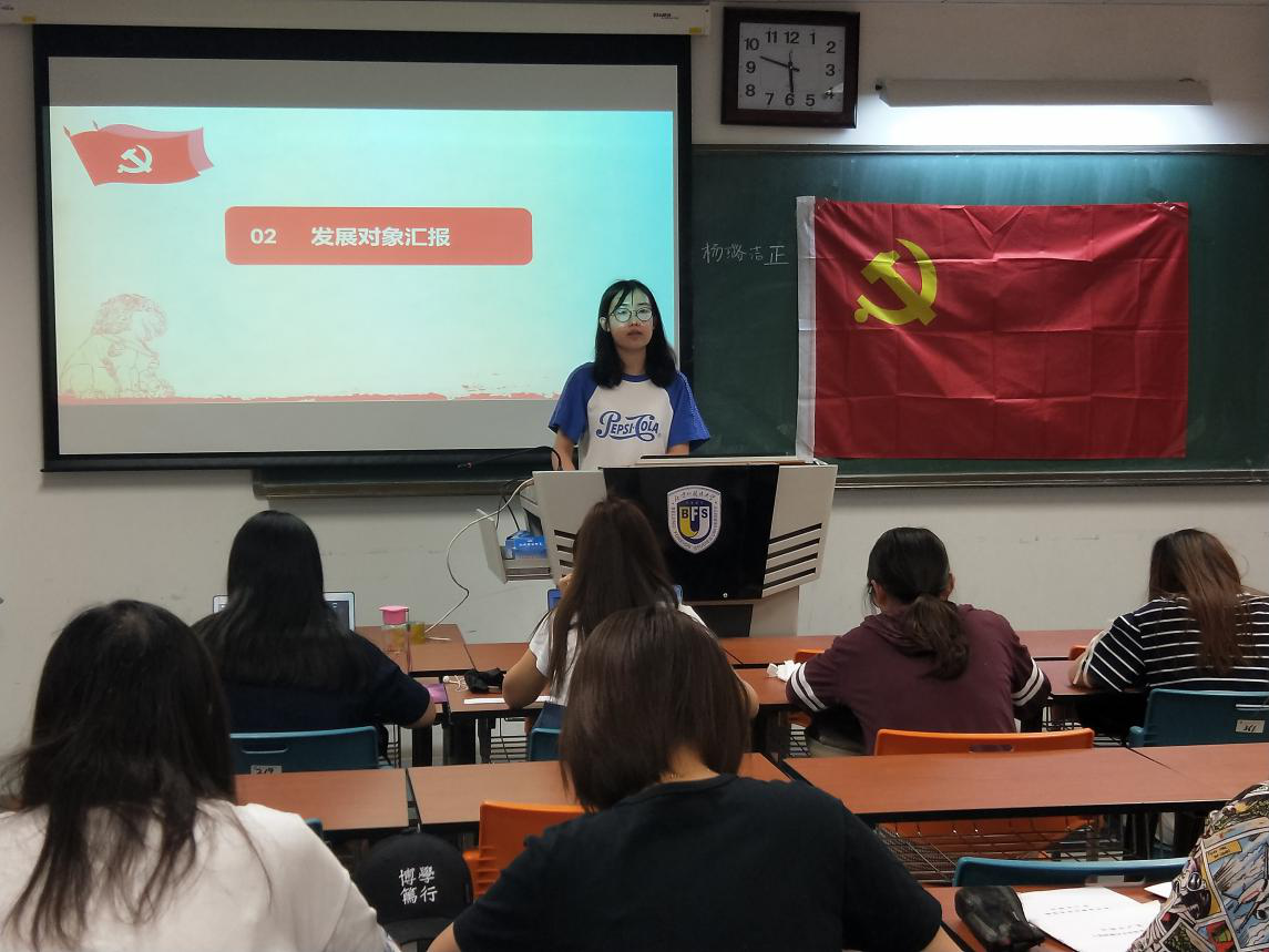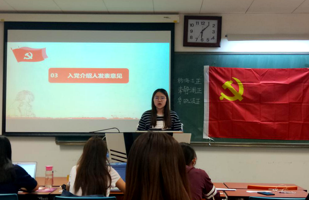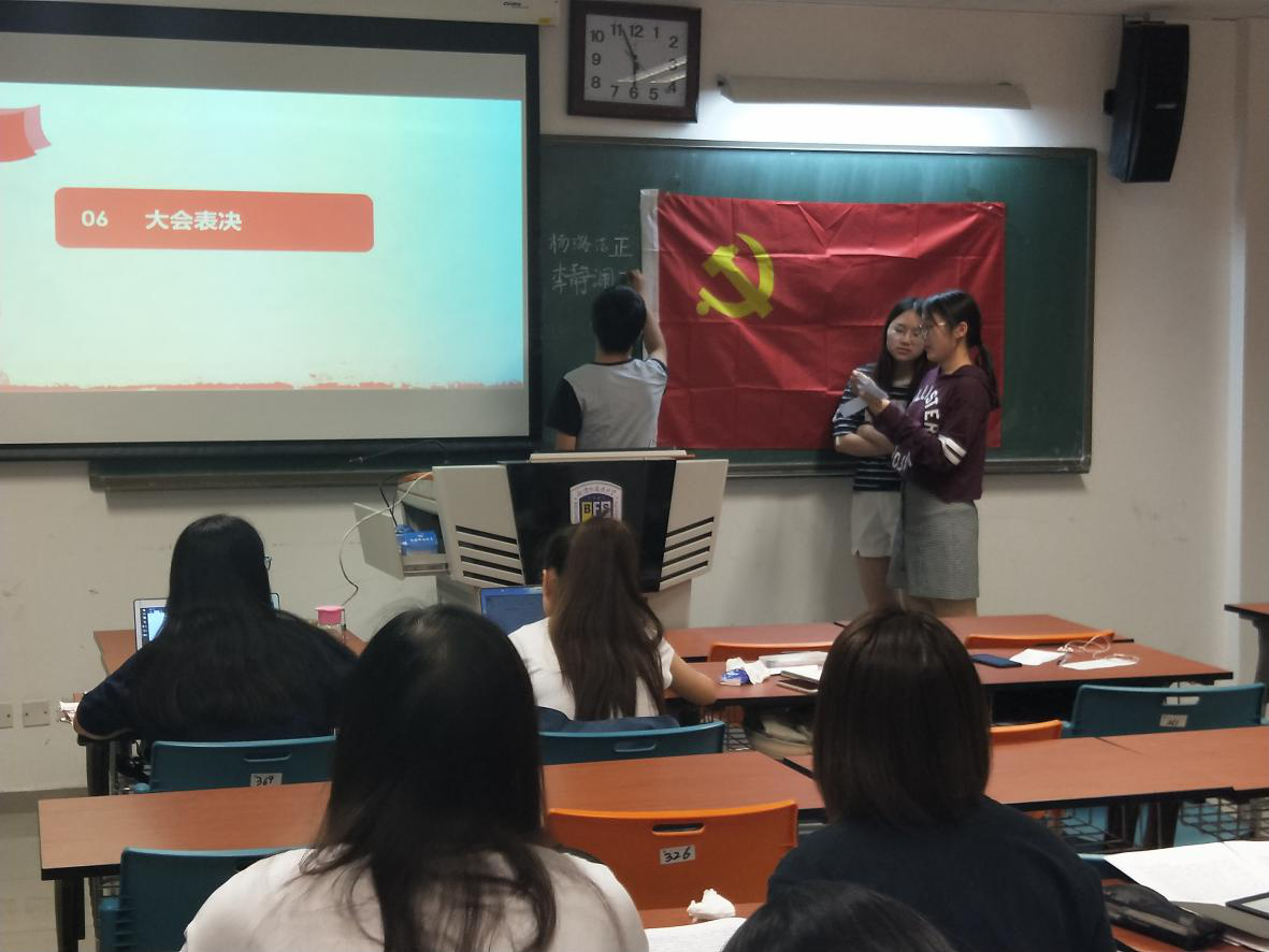 本次大会由党支部书记魏双主持,首先进行了会议人员的清点,并宣布到会情况,发展大会共分九项议程:报告到会党员人数、发展对象宣读志愿书、介绍人发表意见、支部委员会报告发展对象审查情况、与会党员充分讨论并发表意见、大会表决、宣读支部大会决议、发展对象表态以及最后所有与会成员起立合唱国际歌。与会有表决权的党员以无记名投票的方式对是否同意接收杨璐洁、李静澜、叶子萌、黄菲莎、华晓涵和周璐6位同志为预备党员依次进行表决,应到会有表决权党员6人,实到有表决权党员5名, 表决结果为5人赞成,0人反对,0人弃权,因此大会决定同意接收这6位同志为预备党员。