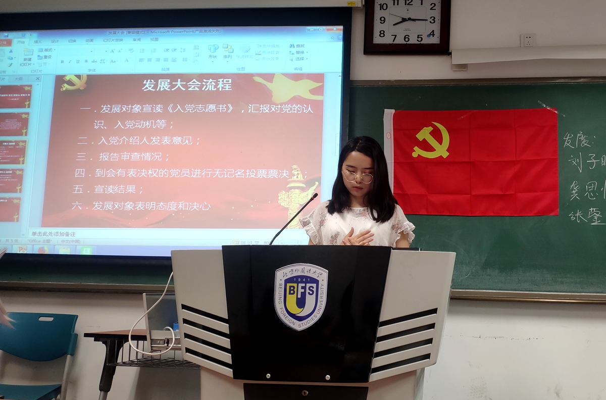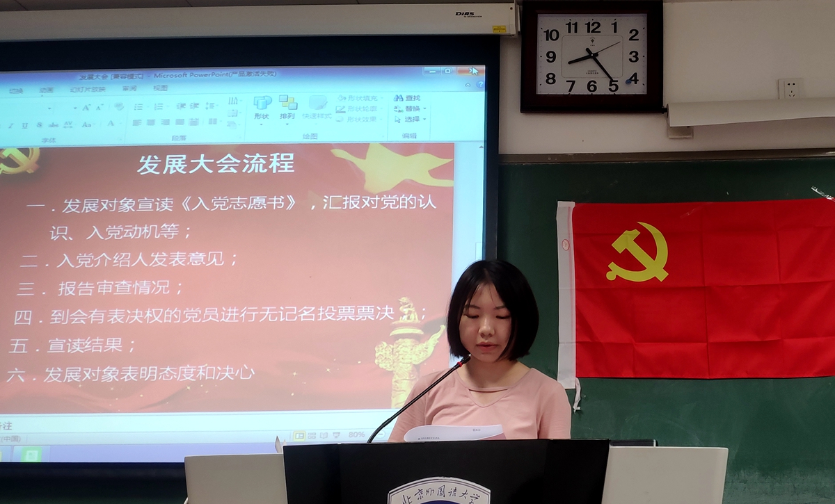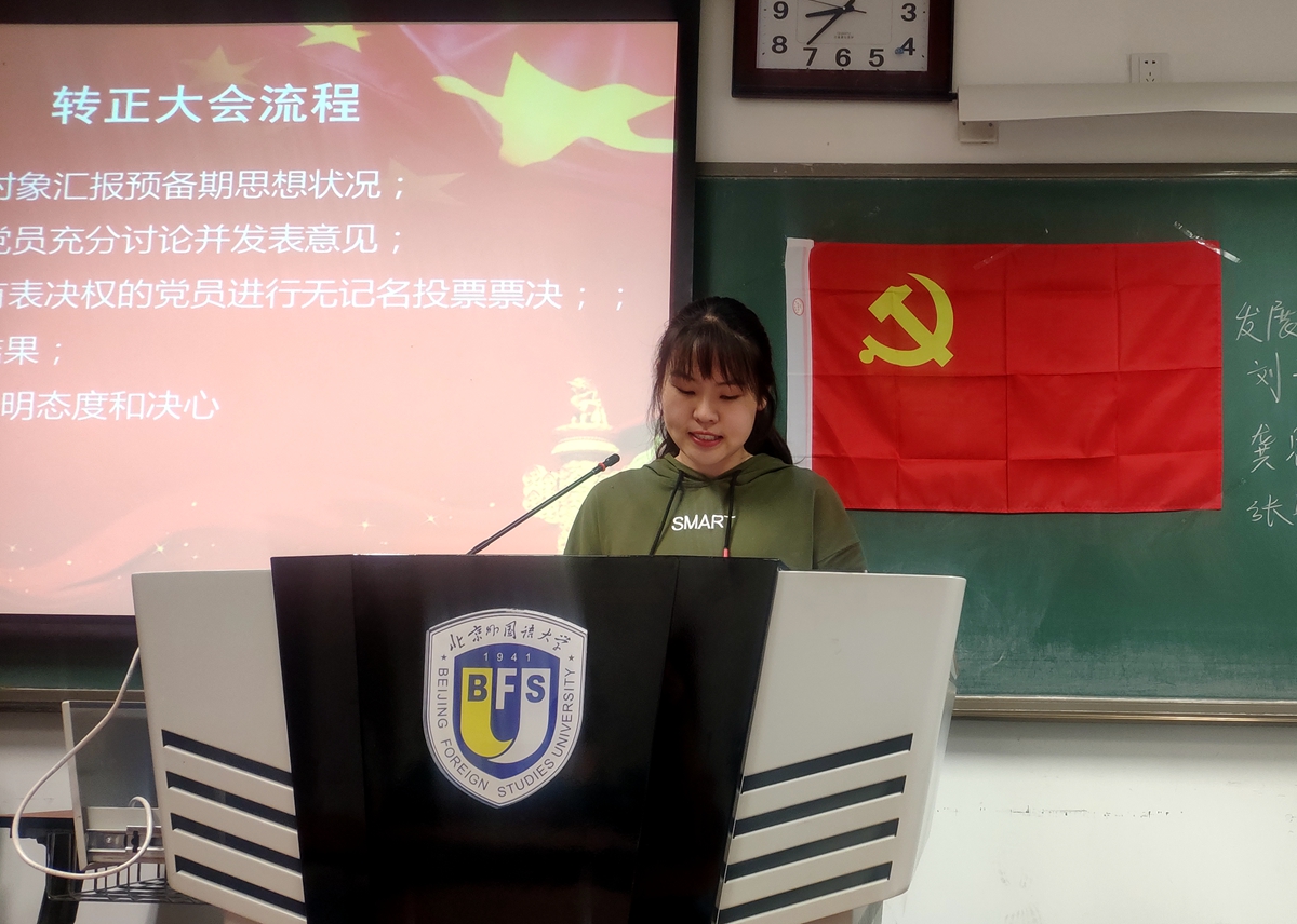 发展对象龚思怡同志、刘子昕和张蓥同志宣读《入党志愿书》,汇报对党的认识、入党动机等。然后由入党介绍人王家琛和袁晓敏发表意见,两位均赞成龚思怡、刘子昕和张蓥同志入党。接下来由主持人报告审查情况,宣读综合考察报告。然后是到会有表决权的党员进行无记名投票票决,结果为同意龚思怡、刘子昕和张蓥同志转为预备党员。最后,龚思怡、刘子昕和张蓥同志感谢支部同志们对她的培养,决心以今天为人生的新起点,更加严格要求自己,努力成为一名名符其实的中国共产党员。