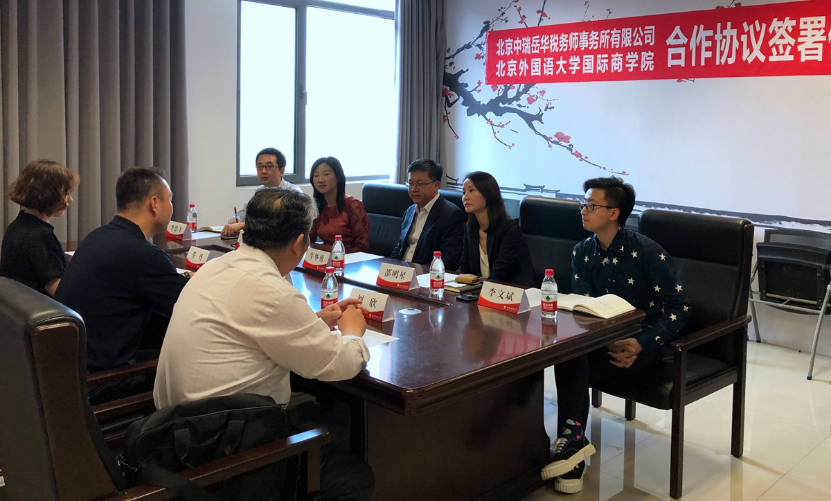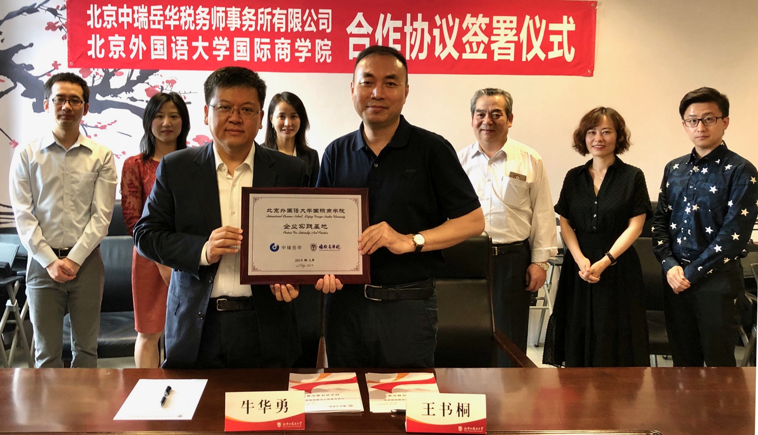 5月16日,国际商学院与北京中瑞岳华税务师事务所有限公司签署了战略合作备忘录,并向北京中瑞岳华税务师事务所有限公司颁授“北京外国语大学国际商学院企业实践基地”牌匾。本次合作意味着双方即将在学生实践、人才培养、产学研融合等方面进行全方位的合作。北京中瑞岳华税务师事务所有限公司总经理王书桐、行政总监刘欣、高级经理乔丹,国际商学院院长牛华勇,院长助理、学生事务办公室主任李文斌,会计与财务管理系教师黄晓燕,国内合作办公室副主任李思飞、事务主管陈钰茜参加签约仪式,仪式由国际商学院副院长邵明星主持。
