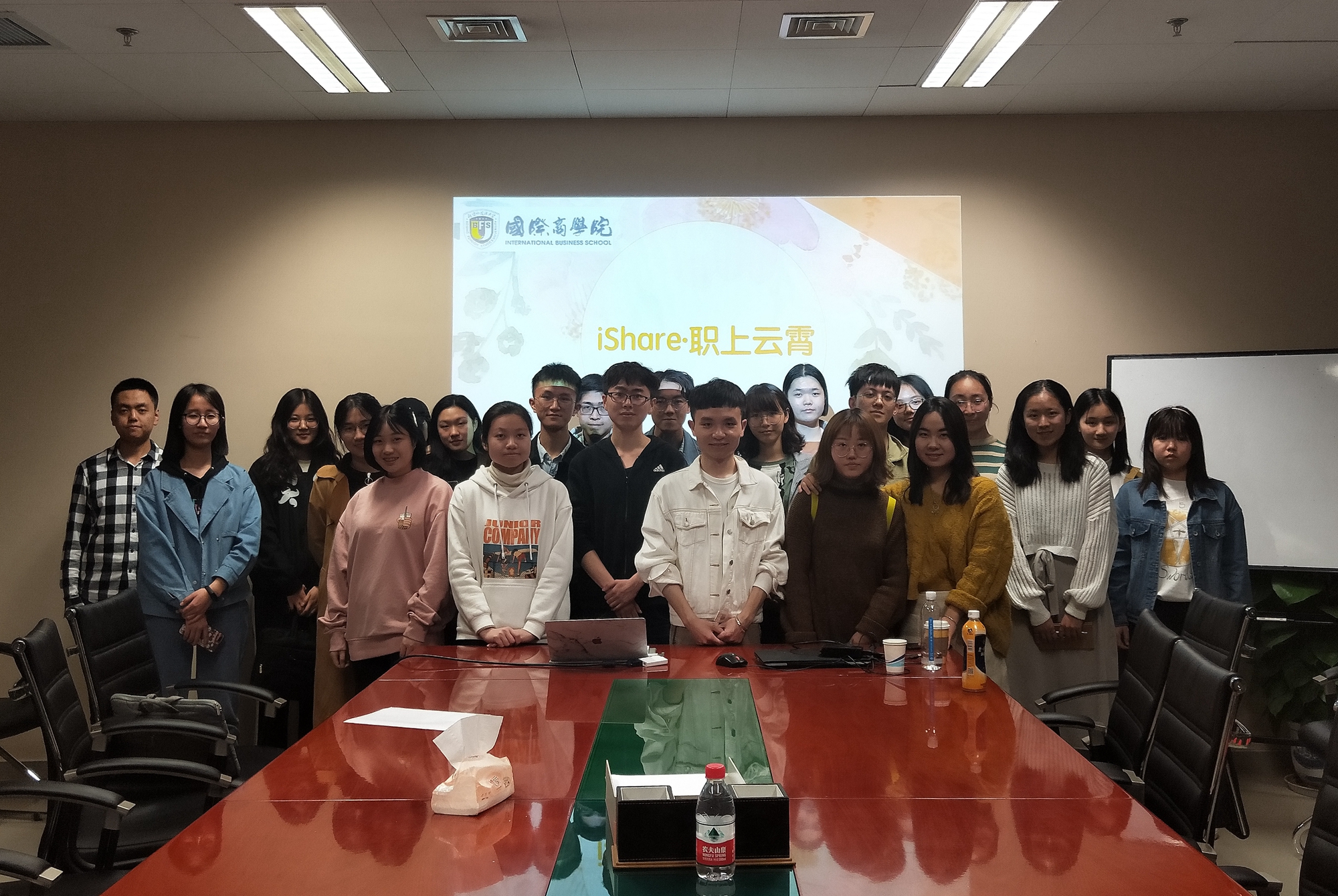 4月13日19:00,北京外国语大学国际商学院“i Share·职上云霄”面试简历分享会于北外国际大厦916会议室举行。本次分享会主讲人为17届毕业校友杨国威。国际商学院本科生团总支书记邓会荟,国商近三十名2017、2018级本科生共同参加本次分享会。
